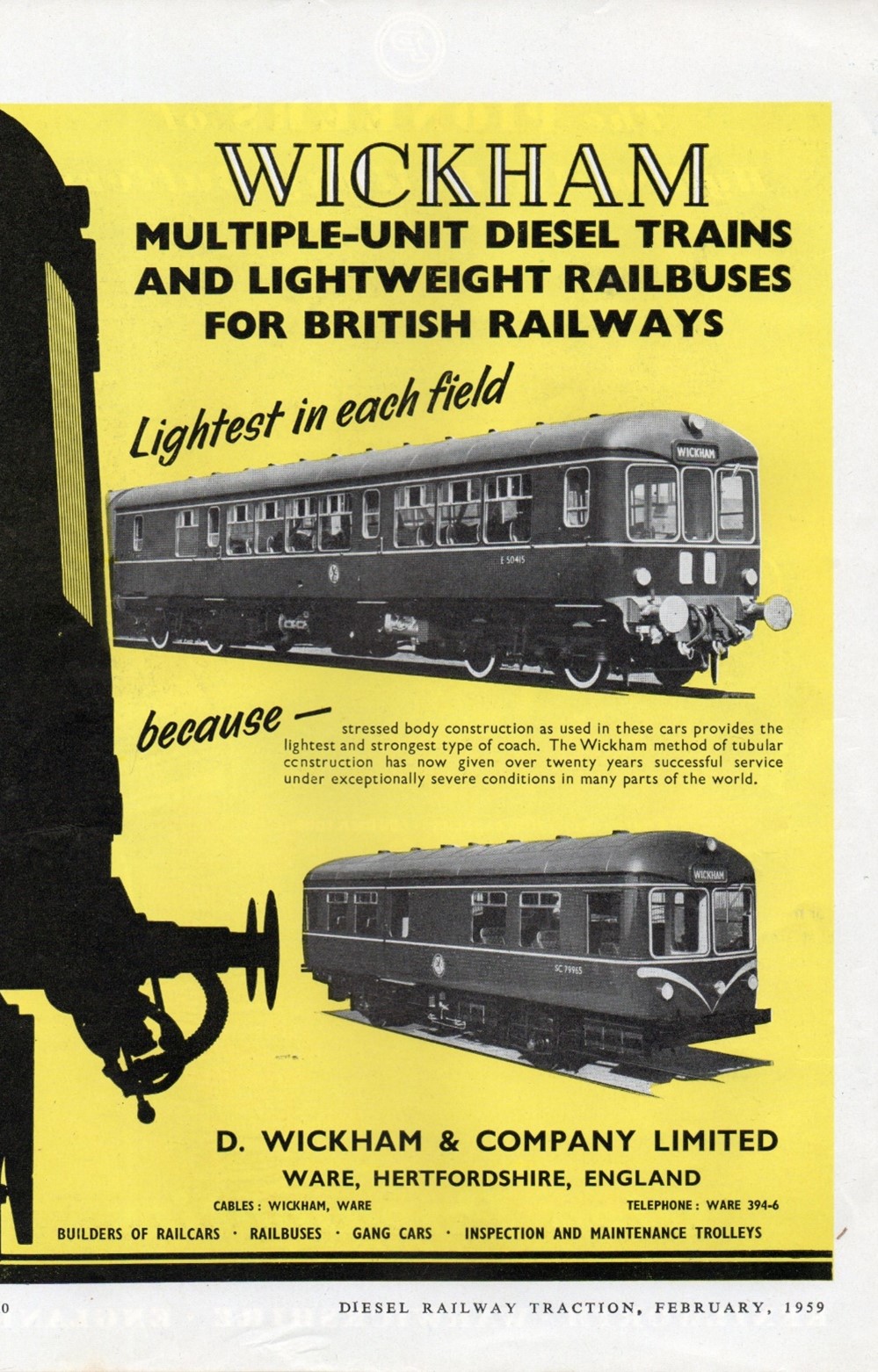The company was originally founded by William Wickham in 1882. It was then that the company first started to brew Ware Pale Ale and Light Bitter. This was supplied to families and Inns in casks & put into cellars. In 1890 Denis Wickham a family member patent machinery for carbonating & bottling beer and other frothing liquids. At that time the company’s workshops were then situated at the Star Brewery, High Street, Ware in Hertfordshire, In 1912 the company had now become D. Wickham & Company Limited. brewery & general engineers with a new premises in Viaduct Road, Ware. The company then started to expand its engineering ability with the production of manhole covers and even car repairs. The company built its first railcar in April 1932 for the 3 ft 6in gauge Taltal Railway in Chile…The company then went on to build many railcars with some even for British Railways. It also built many rail maintenance railway trollies that are still being used today on many preserved railways. The company was at one time one of the largest employers in Ware and had established a worldwide reputation for themselves as suppliers to the railway industry. The company later when on to produce various types of plant equipment… A direct connection with the River Lea was established in 1961 when an order was placed with the company to build a number of barge towing tractors of which some are still preserved today. The company closed in 1991.