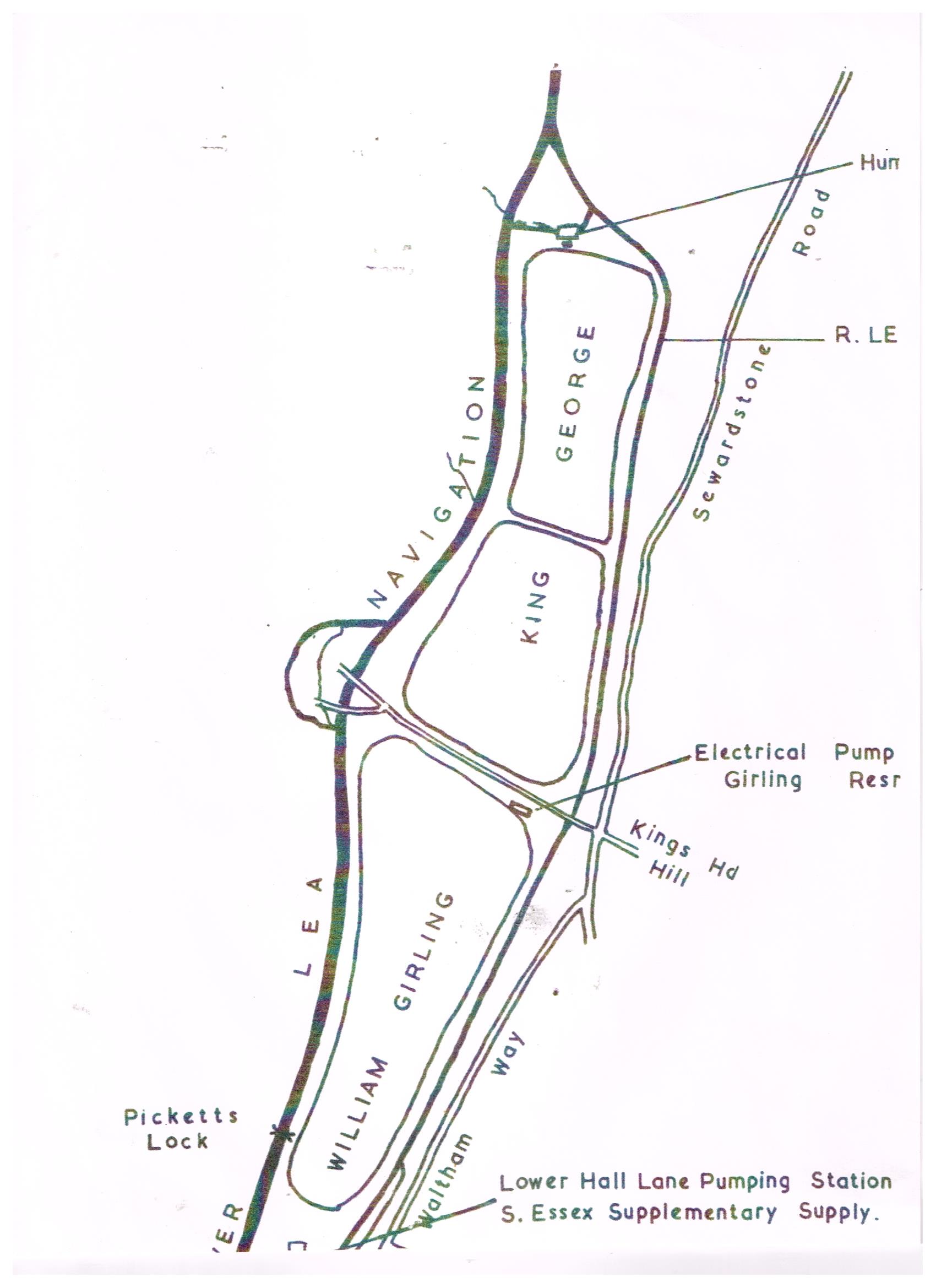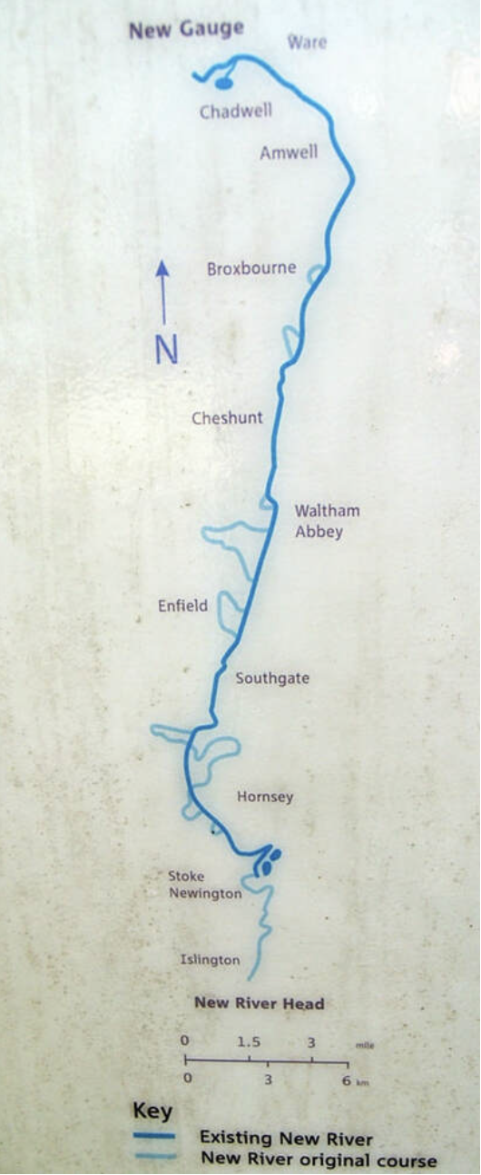 The New River is not a river as such, but an artificial waterway designed to supply fresh drinking water to central London. The water was taken from springs near Ware in Hertfordshire. These springs were situated at Amwell and Chadwell. The river terminates in Islington London by the Sadler’s wells theatre. The river was opened in 1613 and was conceived originally by Edmund Colthurst and completed by Sir Hugh Myddelton. The river was operated by the New River Company for three hundred years before being taken over by the Metropolitan Water Board in 1904. Today the river feeds several reservoirs such as the King Georges at Chingford. However due to the volume of water required by Londoners today water is also taken from the River Lea.